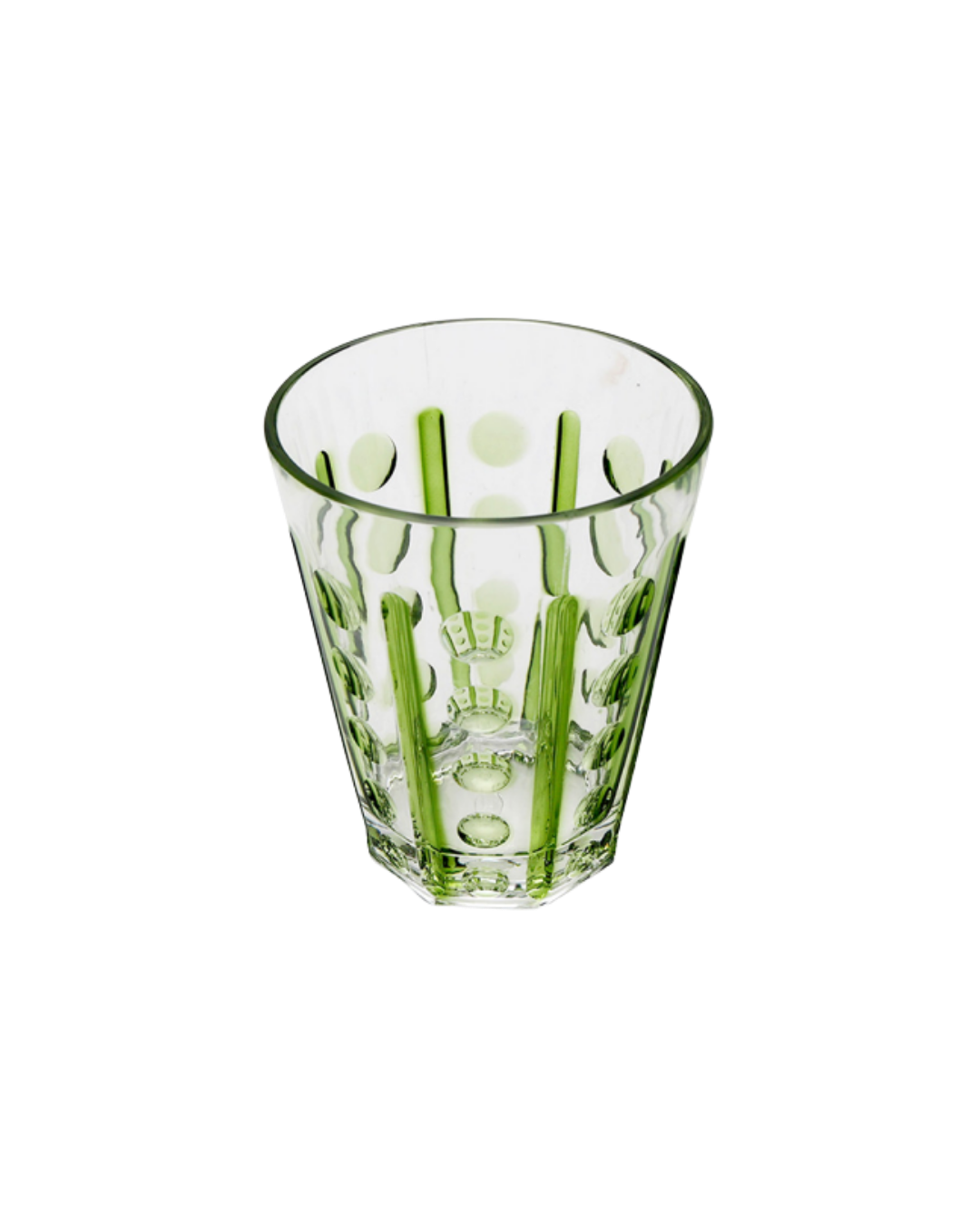 Sua forma ergonômica proporciona um uso confortável e seguro, enquanto a transparência do acrílico, aliada ao padrão em verde de bolas e listras, valoriza a apresentação das bebidas, destacando suas cores e acrescentando um toque descontraído e encantador à mesa.