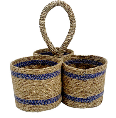 Porta Talher De Palha Formato Cesto Redondo Com Detalhe Azul 21x23cm