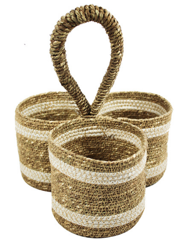 Porta Talher De Palha Formato Cesto Redondo Com Detalhe Branco 21x23cm